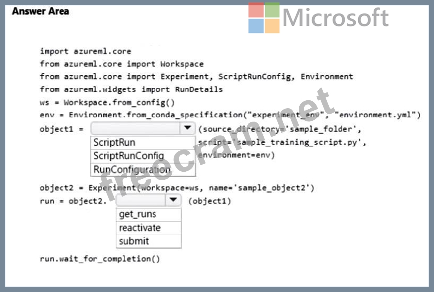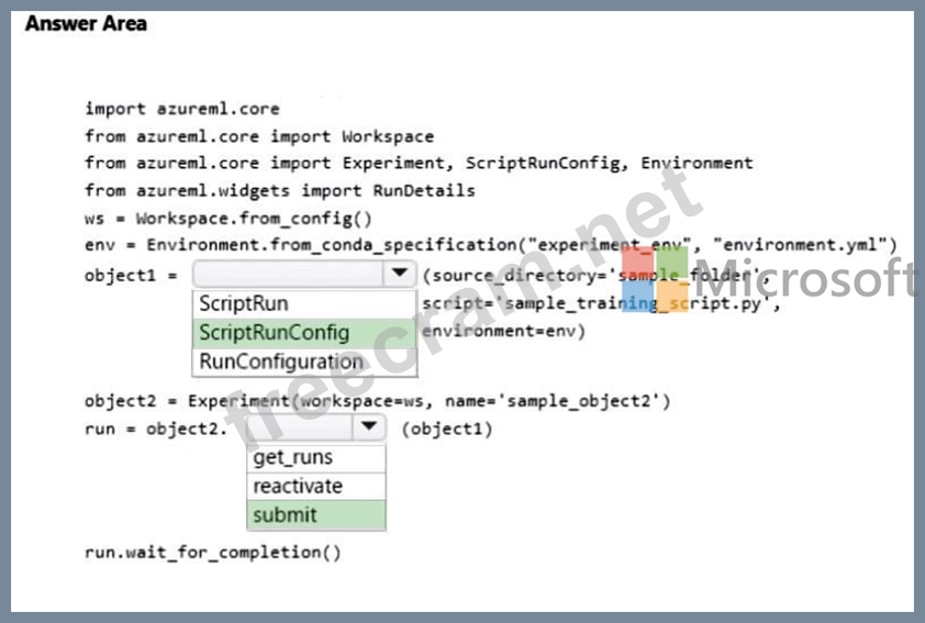 You manage an Azure Machine Learning workspace. You create a training script named sample_training_script.py. The script is used to train a predictive model in the conda environment defined by a file named environment.yml.
