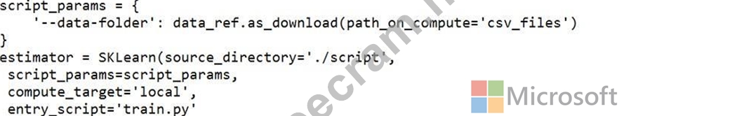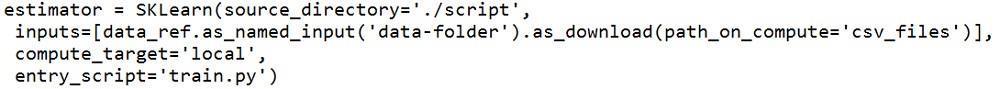 You need to configure the estimator for the experiment so that the script can read the data from a data reference named data_ref that references the csv_files folder in the training_data datastore.