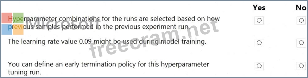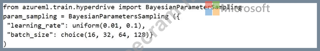uniform(low, high) - Returns a value uniformly distributed between low and high Box 3: No Bayesian sampling does not currently support any early termination policy.