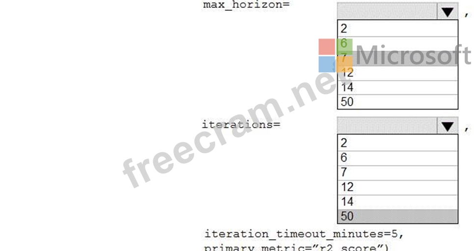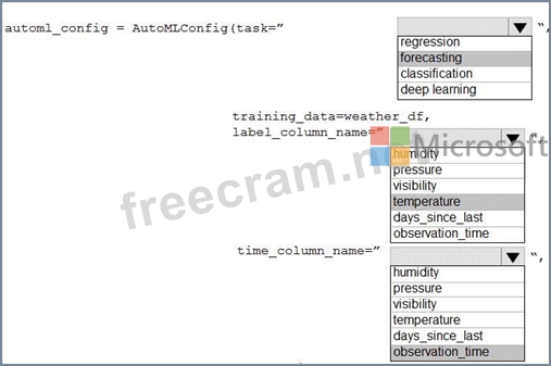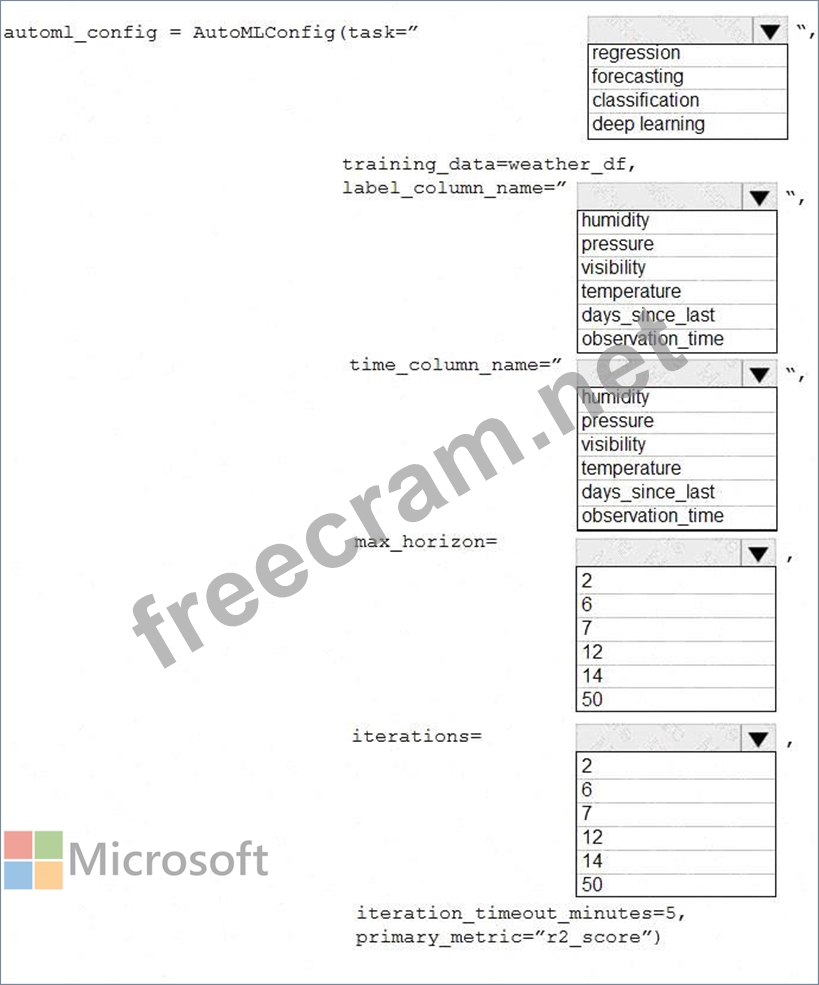 How should you complete the AutoMLConfig definition? To answer, select the appropriate options in the answer area.