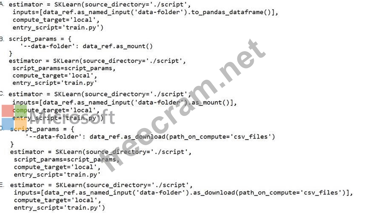 You create a datastore named training_data that references a blob container in an Azure Storage account. The blob container contains a folder named csv_files in which multiple comma-separated values (CSV) files are stored.