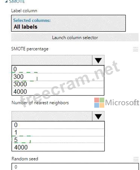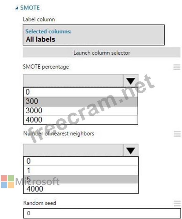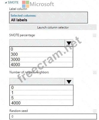 The training set is imbalances between two classes. You must increase the number of training examples for class 1 to 4,000 by using 5 data rows. You add the Synthetic Minority Oversampling Technique (SMOTE) module to the experiment.