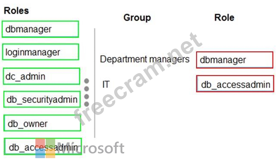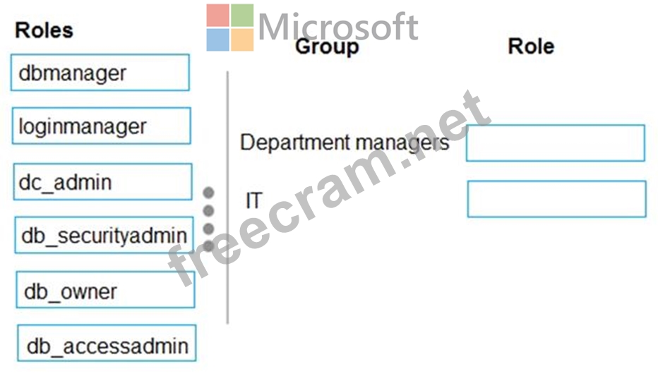Which role memberships should you recommend? To answer, drag the appropriate roles to the correct groups. Each role may be used once, more than once, or not at all. You may need to drag the split bar between panes or scroll to view content.