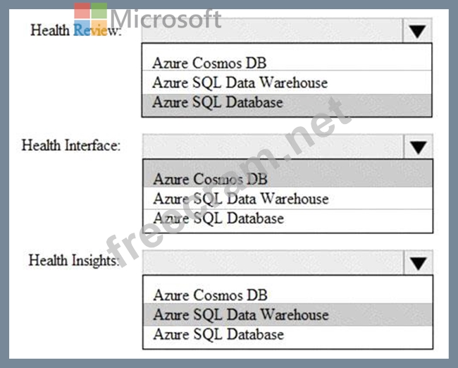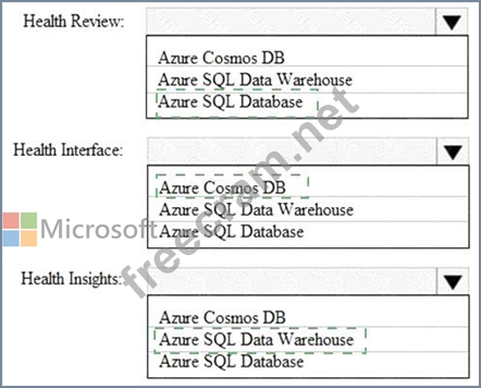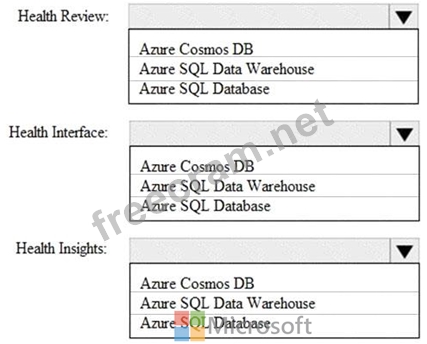 * Upgrade to a data storage solution that will provide flexible schemas and increased throughput for writing data. Data must be regionally located close to each hospital, and reads must display be the most recent committed version of an item.