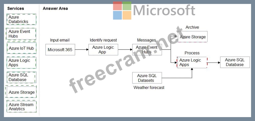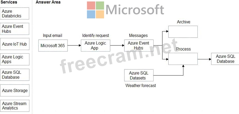 How should you complete the solution? To answer, drag the appropriate services to the correct locations. Each service may be used once, more than once, or not at all. You may need to drag the split bar between panes or scroll to view content.