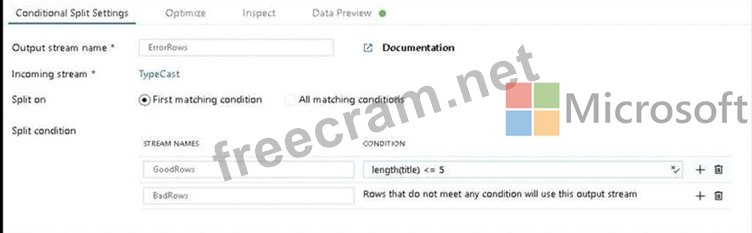 1. This conditional split transformation defines the maximum length of "title" to be five. Any row that is less than or equal to five will go into the GoodRows stream. Any row that is larger than five will go into the BadRows stream.