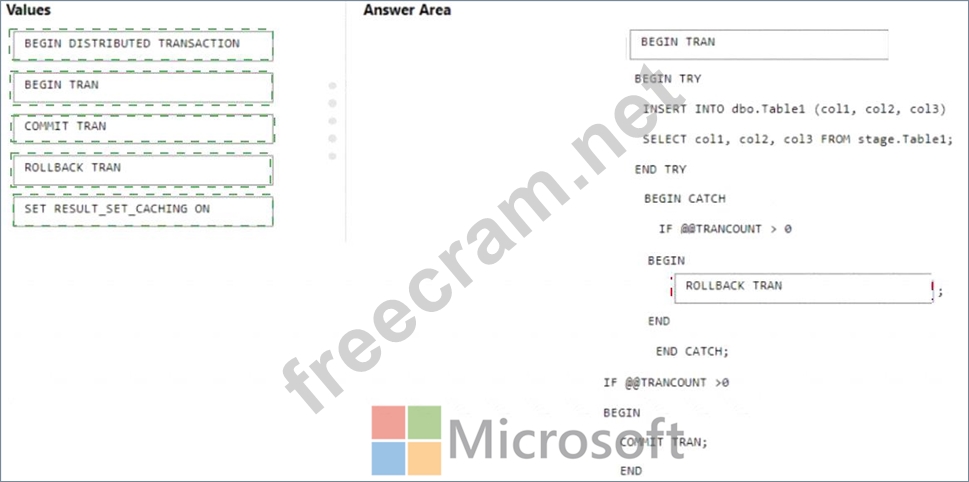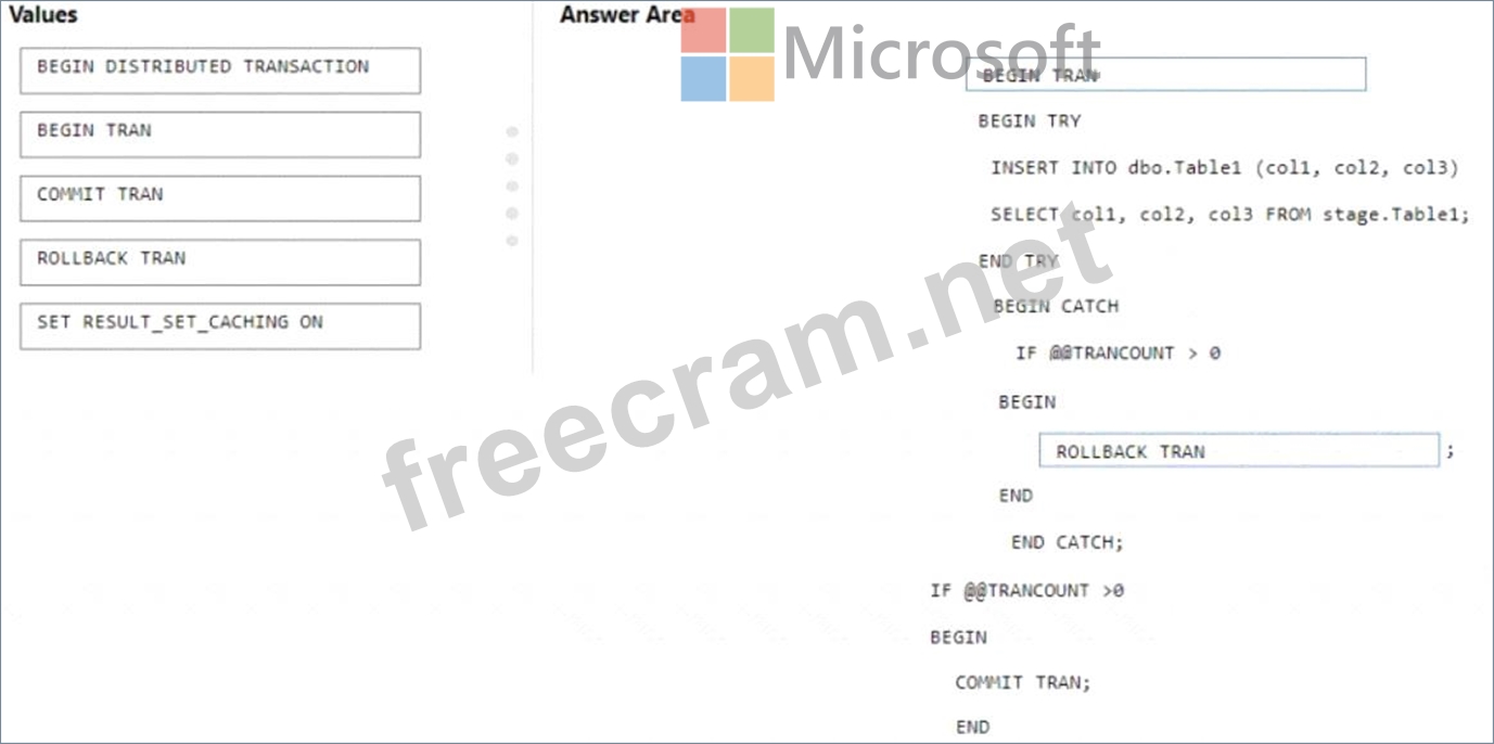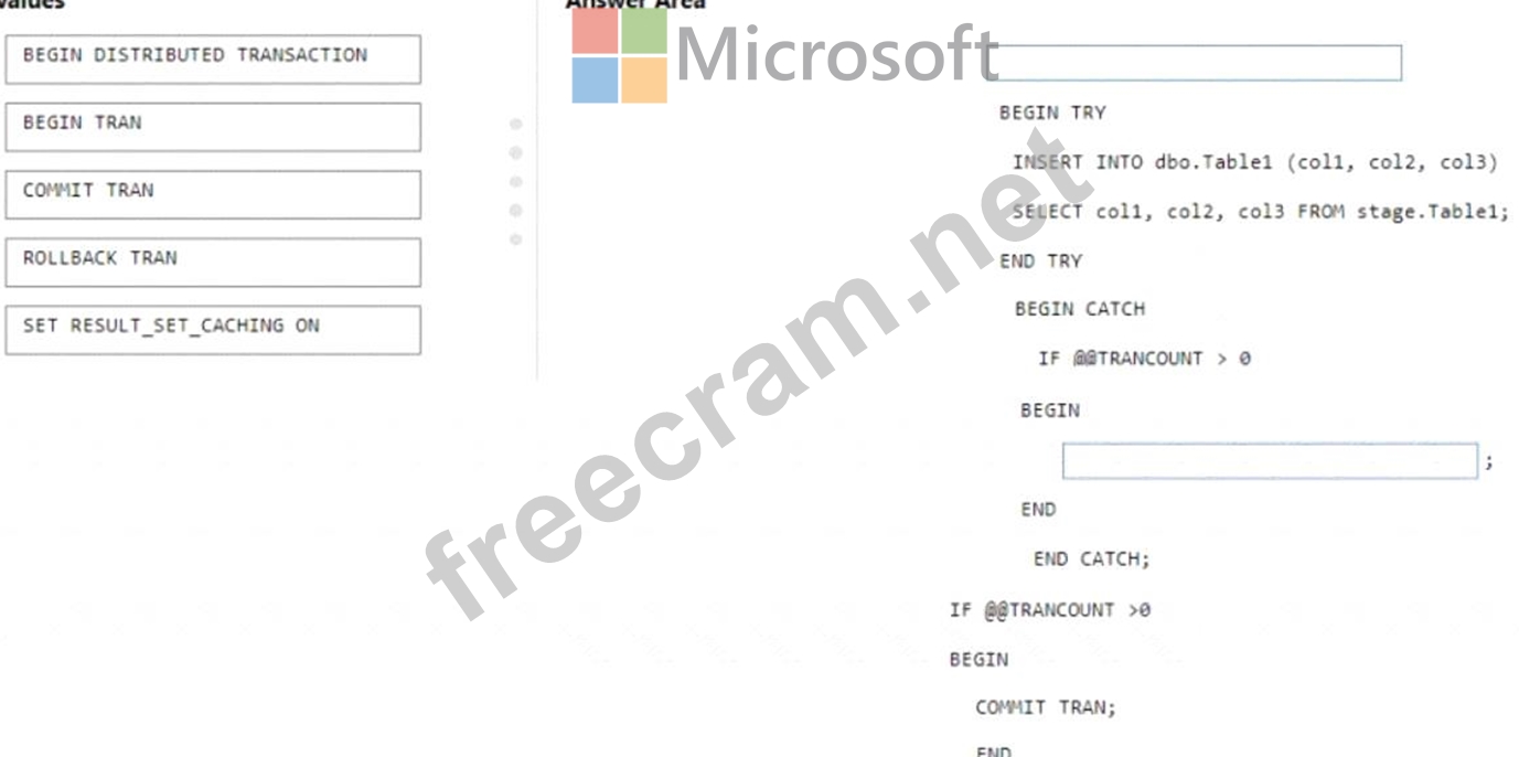 How should you complete the Transact-SQL code? To answer, drag the appropriate values to the correct targets. Each value may be used once, more than once, or not at all. You may need to drag the split bar between panes or scroll to view content.