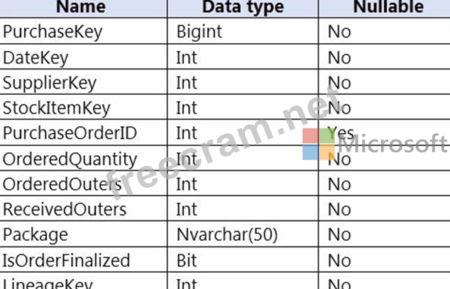 You are designing a fact table named FactPurchase in an Azure Synapse Analytics dedicated SQL pool. The table contains purchases from suppliers for a retail store. FactPurchase will contain the following columns.