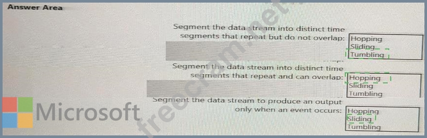 Which windowing function should you use for each requirement? To answer, select the appropriate options in the answer area.