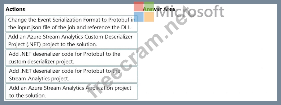Step 2: Add .NET deserializer code for Protobuf to the custom deserializer project Azure Stream Analytics has built-in support for three data formats: JSON, CSV, and Avro. With custom .NET deserializers, you can read data from other formats such as Protocol Buffer, Bond and other user defined formats for both cloud and edge jobs.