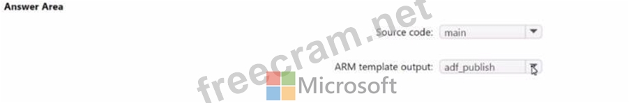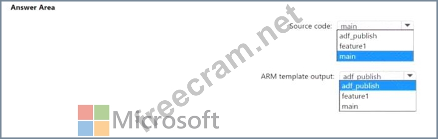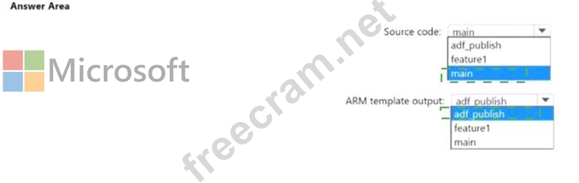The source code of which branch will be built, and which branch will contain the output of the Azure Resource Manager (ARM) template? To answer, select the appropriate options in the answer area.