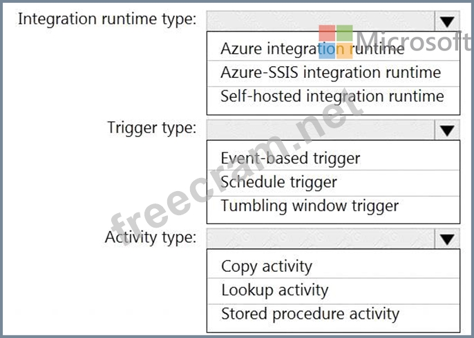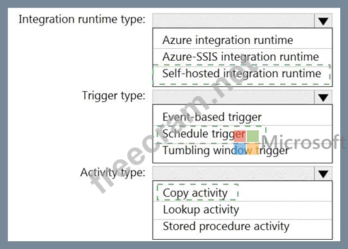 Which Azure Data Factory components should you recommend using together to import the daily inventory data from the SQL server to Azure Data Lake Storage? To answer, select the appropriate options in the answer area.