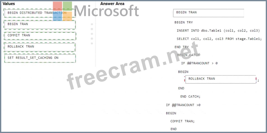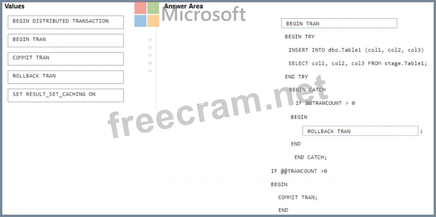 How should you complete the Transact-SQL code? To answer, drag the appropriate values to the correct targets. Each value may be used once, more than once, or not at all. You may need to drag the split bar between panes or scroll to view content.