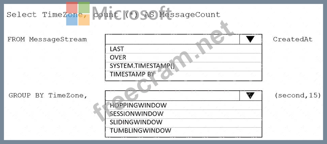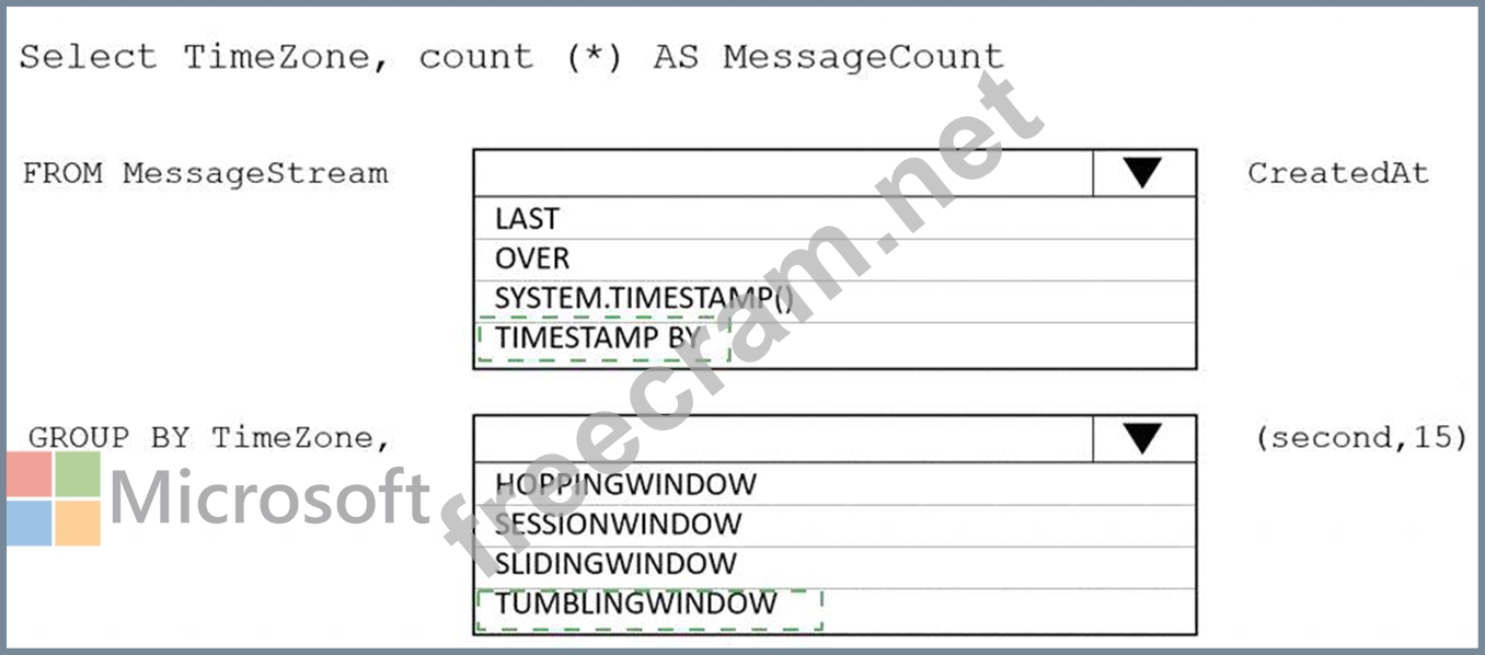 How should you complete the Stream Analytics query? To answer, select the appropriate options in the answer area.
