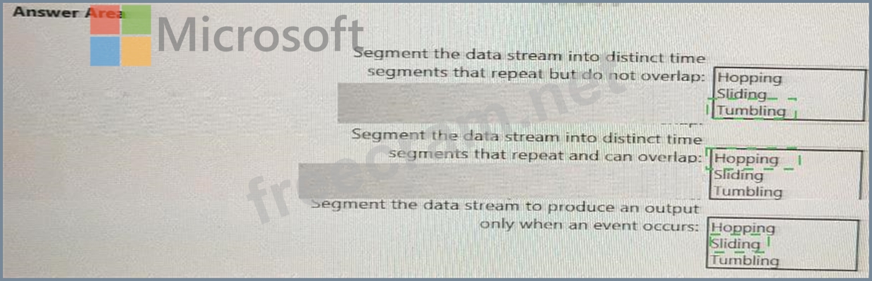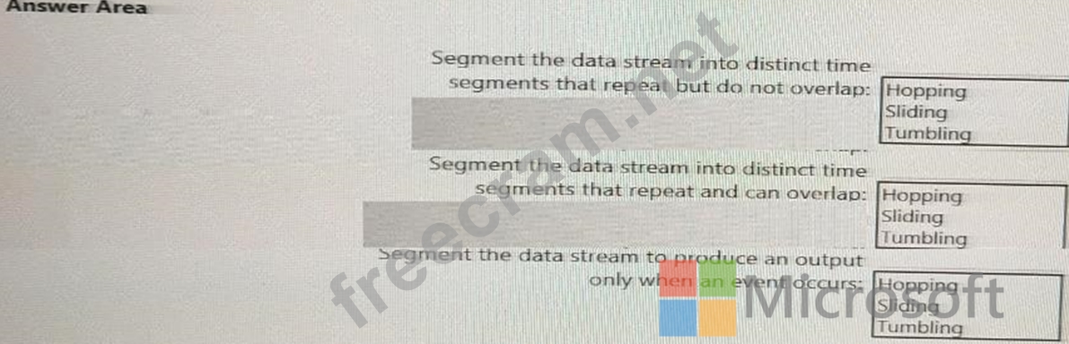 Which windowing function should you use for each requirement? To answer, select the appropriate options in the answer area.
