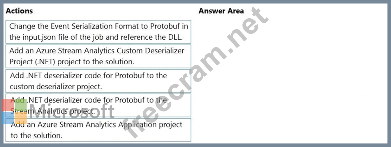 Step 2: Add .NET deserializer code for Protobuf to the custom deserializer project Azure Stream Analytics has built-in support for three data formats: JSON, CSV, and Avro. With custom .NET deserializers, you can read data from other formats such as Protocol Buffer, Bond and other user defined formats for both cloud and edge jobs.