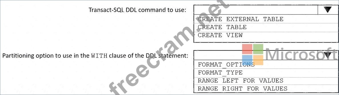 Scenario: Load the sales transaction dataset to Azure Synapse Analytics Box 2: RANGE RIGHT FOR VALUES Scenario: Partition data that contains sales transaction records. Partitions must be designed to provide efficient loads by month. Boundary values must belong to the partition on the right.