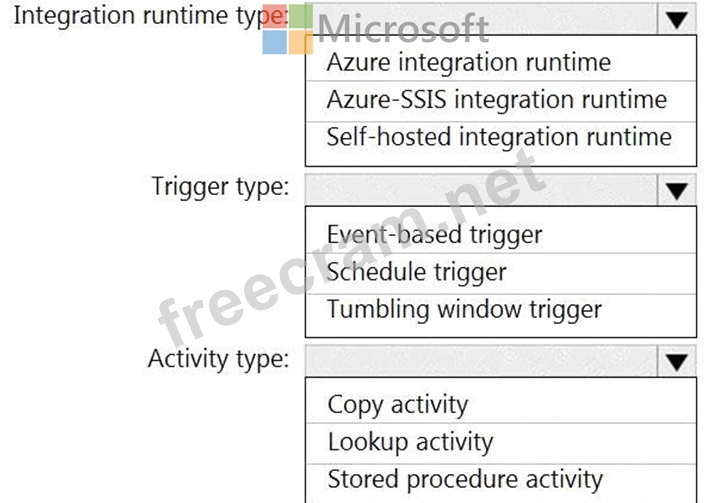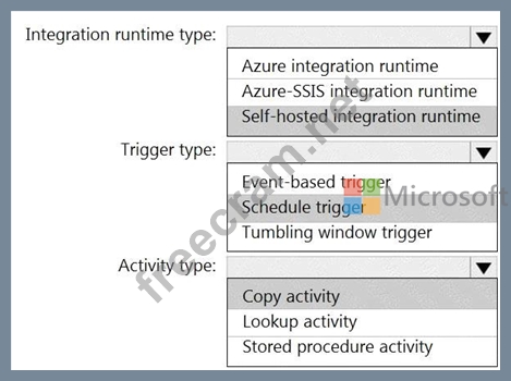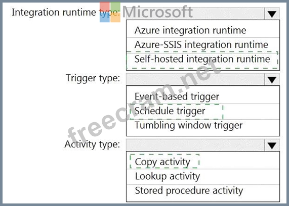 Which Azure Data Factory components should you recommend using together to import the daily inventory data from the SQL server to Azure Data Lake Storage? To answer, select the appropriate options in the answer area.