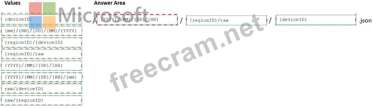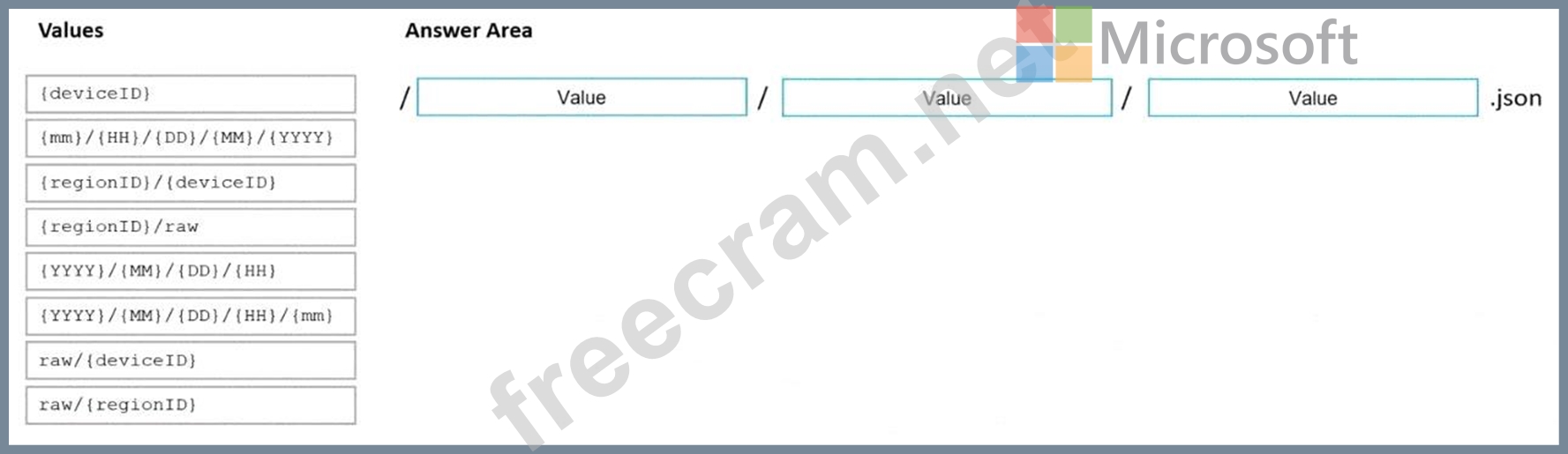 You are designing an Azure Data Lake Storage Gen2 structure for telemetry data from 25 million devices distributed across seven key geographical regions. Each minute, the devices will send a JSON payload of metrics to Azure Event Hubs.