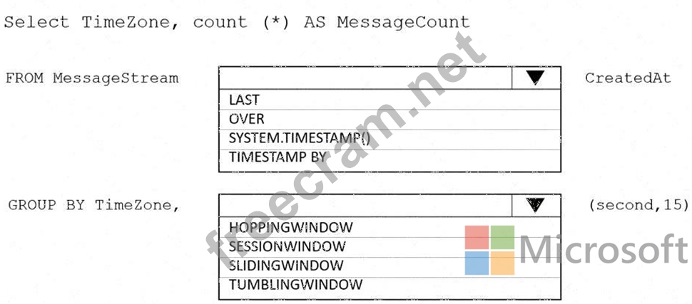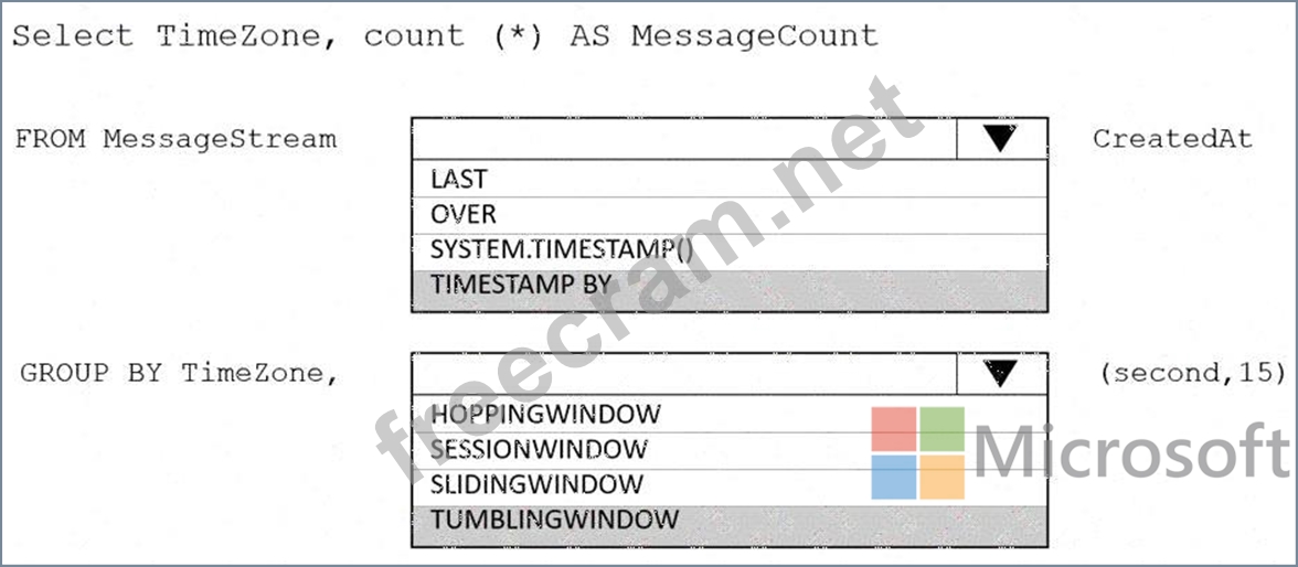 How should you complete the Stream Analytics query? To answer, select the appropriate options in the answer area.