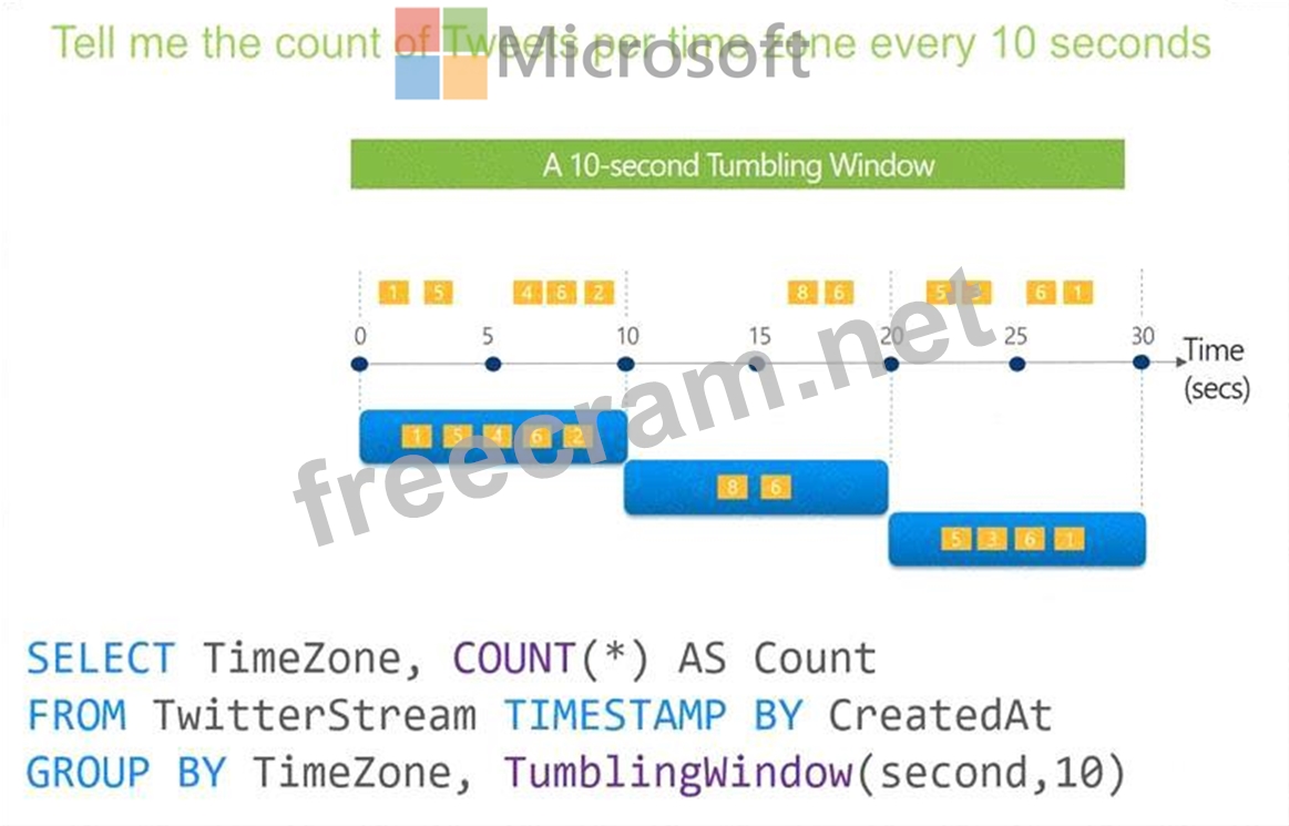 Tumbling window functions are used to segment a data stream into distinct time segments and perform a function against them, such as the example below. The key differentiators of a Tumbling window are that they repeat, do not overlap, and an event cannot belong to more than one tumbling window.