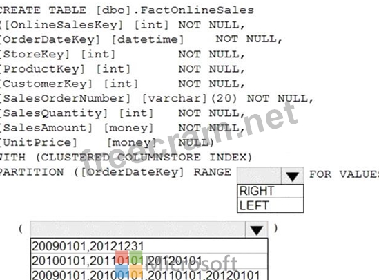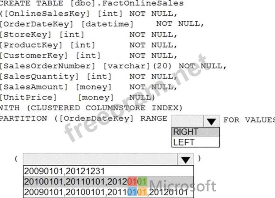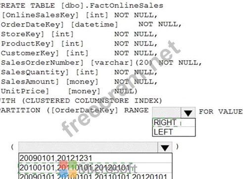 You have an enterprise data warehouse in Azure Synapse Analytics that contains a table named FactOnlineSales. The table contains data from the start of 2009 to the end of 2012.