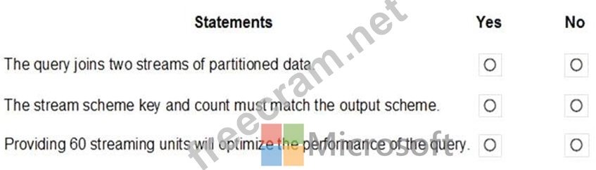 Note: Remember, Streaming Unit (SU) count, which is the unit of scale for Azure Stream Analytics, must be adjusted so the number of physical resources available to the job can fit the partitioned flow. In general, six SUs is a good number to assign to each partition. In case there are insufficient resources assigned to the job, the system will only apply the repartition if it benefits the job.
