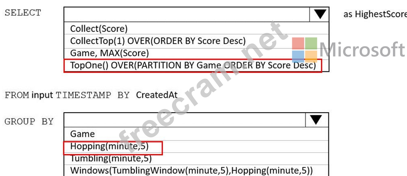 You need to ensure that the job returns the highest scoring record for each five-minute time interval of each game.