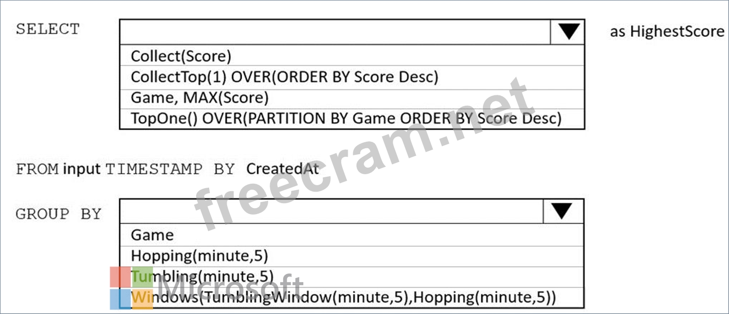 How should you complete the Stream Analytics query? To answer, select the appropriate options in the answer area.