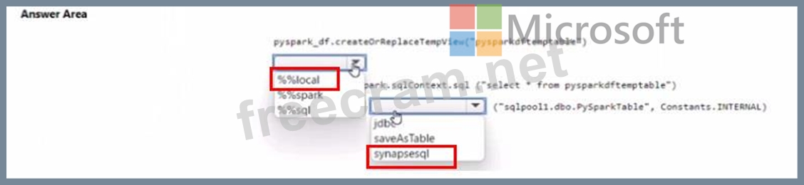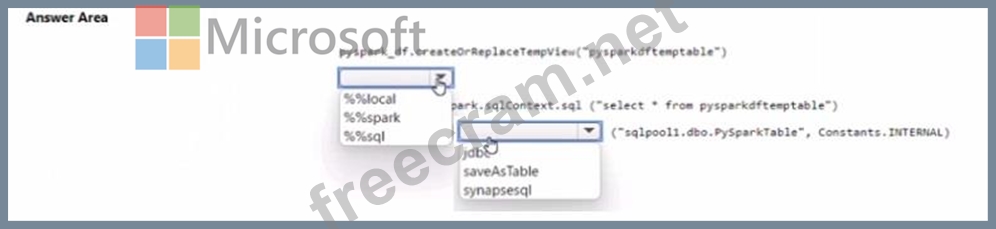 You have an Azure subscription that contains an Azure Synapse Analytics workspace named workspace1. Workspace1 contains a dedicated SQL pool named SQL Pool and an Apache Spark pool named sparkpool. Sparkpool1 contains a DataFrame named pyspark.df.