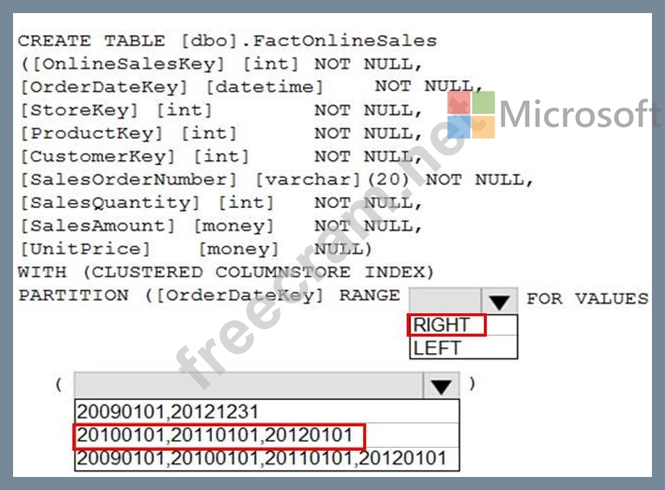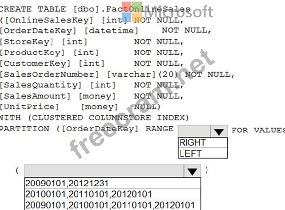 You have an enterprise data warehouse in Azure Synapse Analytics that contains a table named FactOnlineSales. The table contains data from the start of 2009 to the end of 2012.
