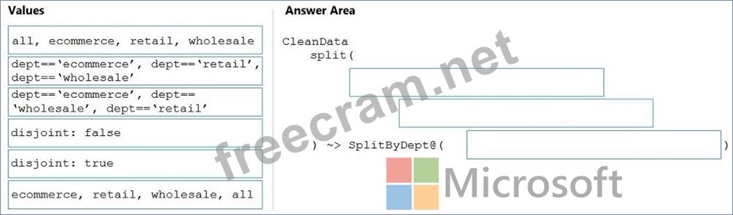 How should you complete the Data Factory data flow script? To answer, drag the appropriate values to the correct targets. Each value may be used once, more than once, or not at all. You may need to drag the split bar between panes or scroll to view content.