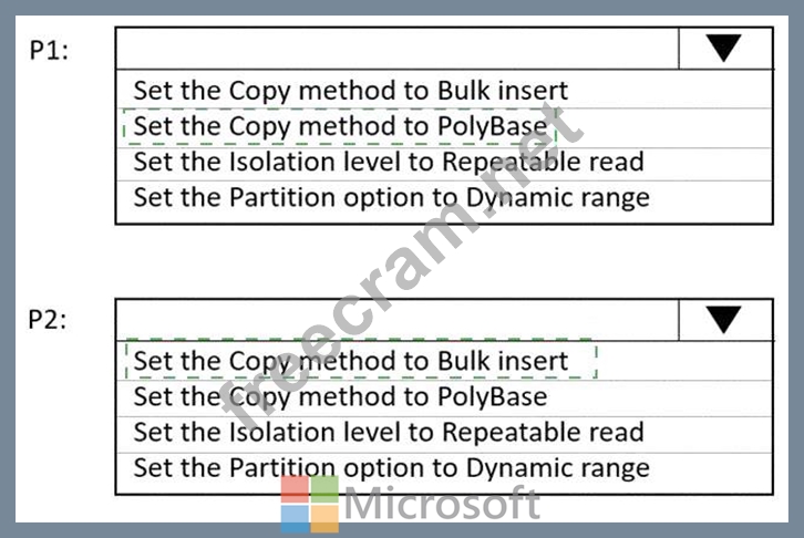 P1: Uses a copy activity to copy data from a nonpartitioned table in a dedicated SQL pool of WS1 to an Azure Data Lake Storage Gen2 account P2: Uses a copy activity to copy data from text-delimited files in an Azure Data Lake Storage Gen2 account to a nonpartitioned table in a dedicated SQL pool of WS2 You need to configure P1 and P2 to maximize parallelism and performance.