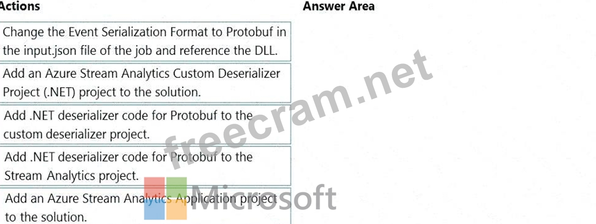 Step 2: Add .NET deserializer code for Protobuf to the custom deserializer project Azure Stream Analytics has built-in support for three data formats: JSON, CSV, and Avro. With custom .NET deserializers, you can read data from other formats such as Protocol Buffer, Bond and other user defined formats for both cloud and edge jobs.