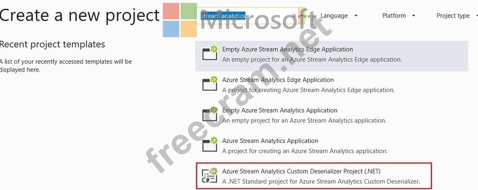 1. Open Visual Studio and select File > New > Project. Search for Stream Analytics and select Azure Stream Analytics Custom Deserializer Project (.NET). Give the project a name, like Protobuf Deserializer.