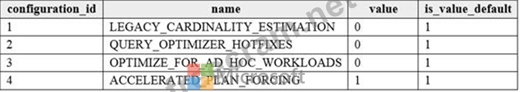 OPTIMIZE_FOR_AD_HOC_WORKLOADS = { ON | OFF } Enables or disables a compiled plan stub to be stored in cache when a batch is compiled for the first time. The default is OFF. Once the database scoped configuration OPTIMIZE_FOR_AD_HOC_WORKLOADS is enabled for a database, a compiled plan stub will be stored in cache when a batch is compiled for the first time. Plan stubs have a smaller memory footprint compared to the size of the full compiled plan. Incorrect Answers: A: LEGACY_CARDINALITY_ESTIMATION = { ON | OFF | PRIMARY } Enables you to set the query optimizer cardinality estimation model to the SQL Server 2012 and earlier version independent of the compatibility level of the database. The default is OFF, which sets the query optimizer cardinality estimation model based on the compatibility level of the database. B: QUERY_OPTIMIZER_HOTFIXES = { ON | OFF | PRIMARY } Enables or disables query optimization hotfixes regardless of the compatibility level of the database. The default is OFF, which disables query optimization hotfixes that were released after the highest available compatibility level was introduced for a specific version (post-RTM). Reference: https://docs.microsoft.com/en-us/sql/t-sql/statements/alter-database-scoped-configuration-transact-sql