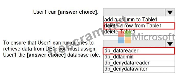 Explanation: Box 1: delete a row from Table1 Members of the db_datawriter fixed database role can add, delete, or change data in all user tables. Box 2: db_datareader Members of the db_datareader fixed database role can read all data from all user tables. Reference: https://docs.microsoft.com/en-us/sql/relational-databases/security/authentication-access/database-level-roles