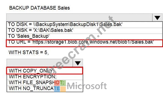 Explanation: Box 1: TO URL = 'https://storage1.blob.core.windows.net/blob1/Sales.bak' Native database backup in Azure SQL Managed Instance. You can backup any database using standard BACKUP T-SQL command: BACKUP DATABASE tpcc2501 TO URL = 'https://myacc.blob.core.windows.net/testcontainer/tpcc2501.bak' WITH COPY_ONLY Box 2: WITH COPY_ONLY Reference: https://techcommunity.microsoft.com/t5/azure-sql-database/native-database-backup-in-azure-sql-managed-instance/ba-p/386154