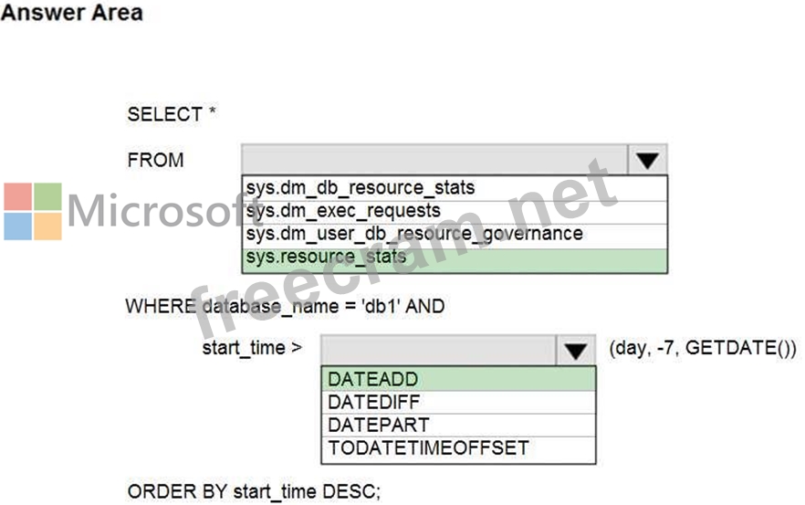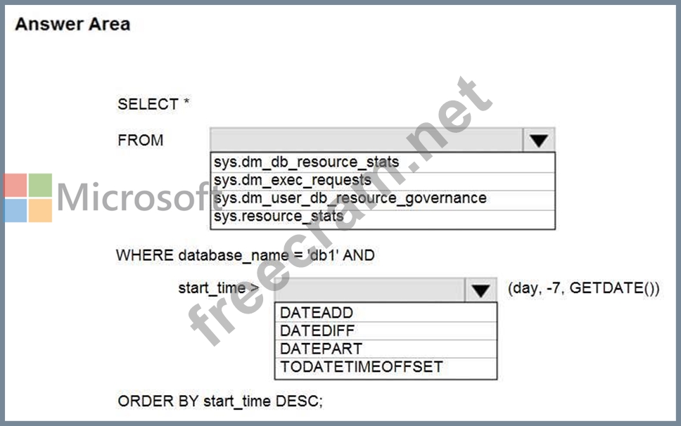 SELECT database_name, AVG(avg_cpu_percent) AS Average_Compute_Utilization FROM sys.resource_stats WHERE start_time BETWEEN @s AND @e GROUP BY database_name HAVING AVG(avg_cpu_percent) >= 80 Incorrect Answers: