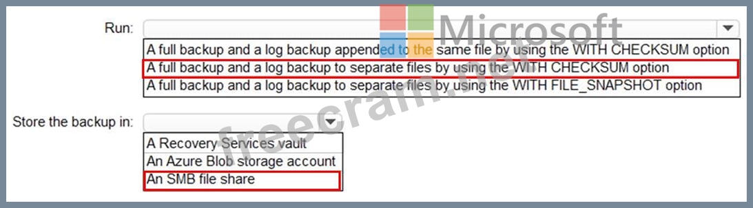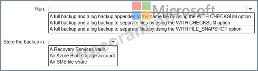 What should you run for the backup and where should you store the backup? To answer, select the appropriate options in the answer area.