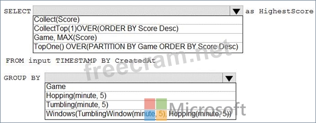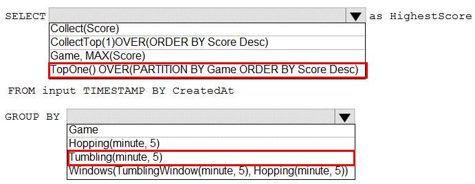 You need to ensure that the job returns the highest scoring record for each five-minute time interval of each game.
