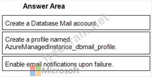 You create a new Azure SQL managed instance named SQL1 and enable Database Mail extended stored You need to ensure that SQ Server Agent jobs running on SQL 1 can notify when a failure Occurs Which three actions should you perform in sequence 7 TO answer. move the appropriate actions from the list Of actions to answer area and arrange them in correct order.