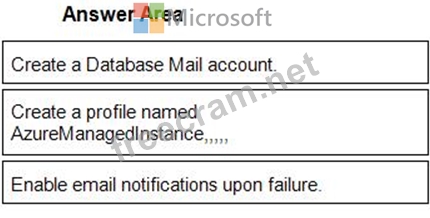 You create a new Azure SQL managed instance named SQL1 and enable Database Mail extended stored You need to ensure that SQ Server Agent jobs running on SQL 1 can notify when a failure Occurs Which three actions should you perform in sequence 7 TO answer. move the appropriate actions from the list Of actions to answer area and arrange them in correct order.