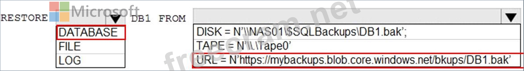 You need to restore a database named DB1 by using Transact-SQL.