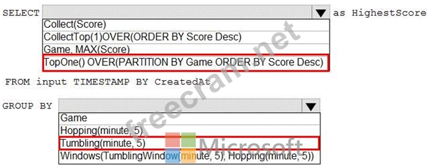 You need to ensure that the job returns the highest scoring record for each five-minute time interval of each game.
