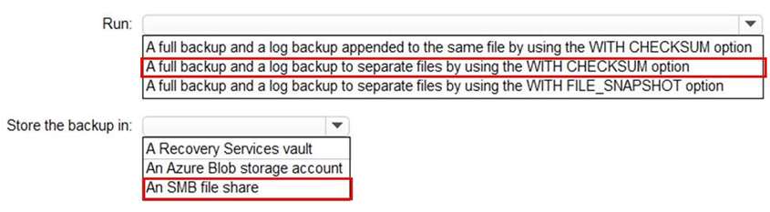 What should you run for the backup and where should you store the backup? To answer, select the appropriate options in the answer area.