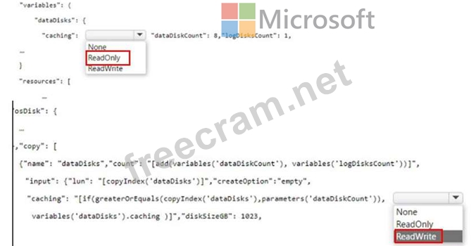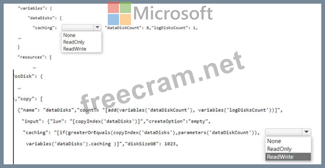 You need to use an Azure Resource Manager ARM) template to deploy an Azure virtual machine that will host a Microsoft SQL Server instance. The solution must maximize disk I/O performance for the SQL Server database and log files How should you complete the template? To answer, select the appropriate options in the answer are a.
