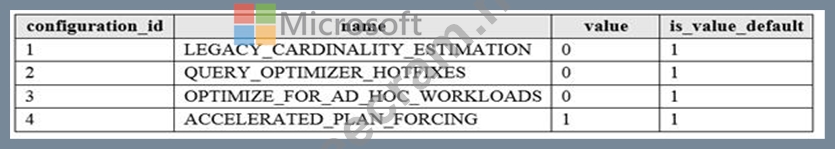 You run the select * from sys.database_scoped_configurations Transact-SQL command and receive the results shown in the following table.