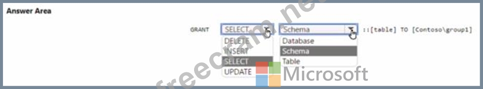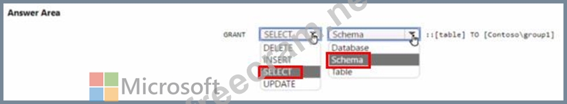 You have an Azure subscription that contains a group named Group1 and an Azure SQL managed instance that hosts a database named 081. You need to ensure that Group 1 has read access to new tables created m 06I The solution must use the principle of least privilege How should you complete the Transact-SQL statement' To answer, select the appropriate options in the answer are a. NOTE: Each correct selection is worth one point.