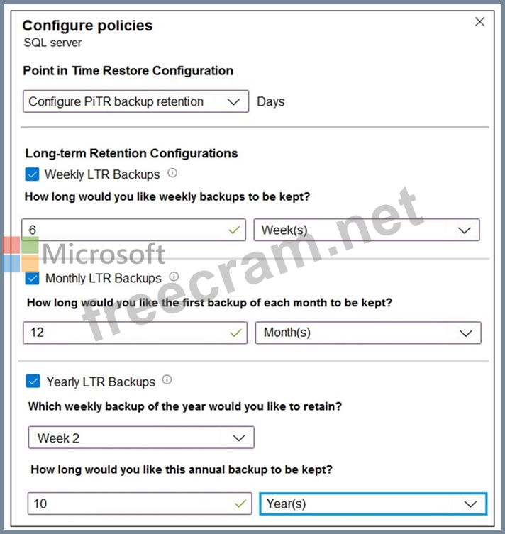 You configure a long-term retention policy for an Azure SQL database as shown in the exhibit. (Click the Exhibittab.)